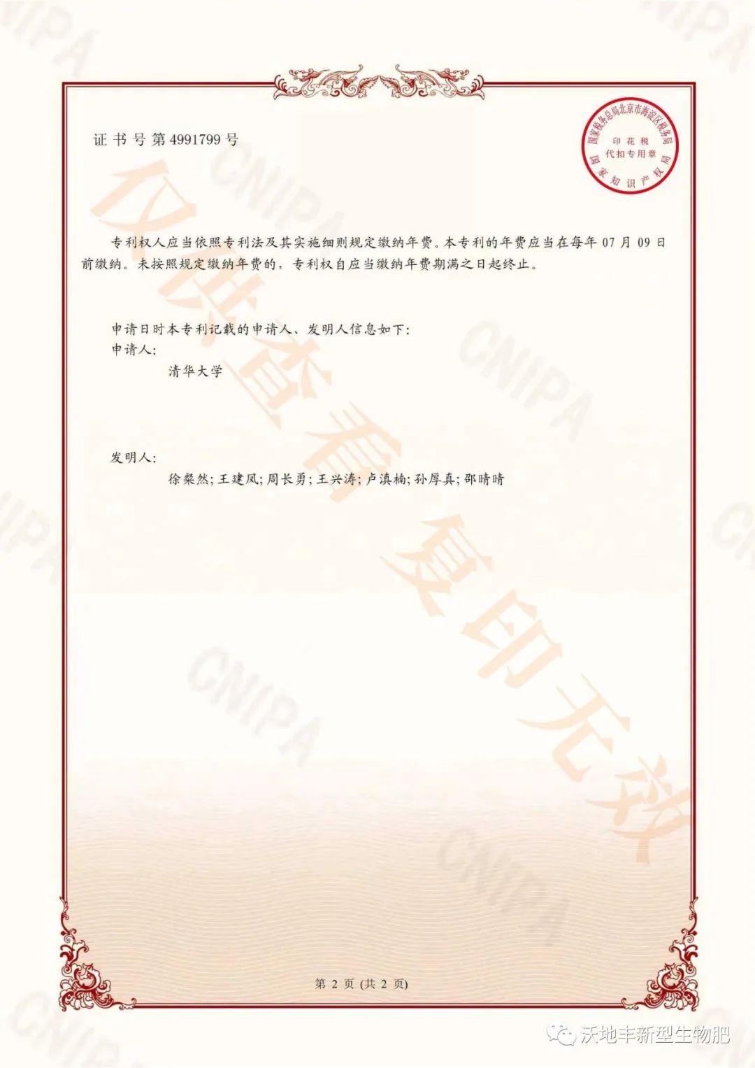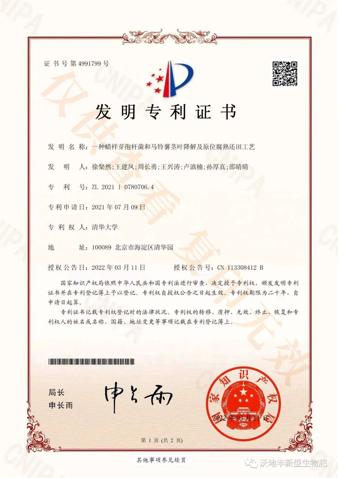 日前,该发明专利经国家知识产权局严格筛选和层层审核荣获发明专利证书授权。沃地丰公司董事长孙厚真、研发主任邵晴晴获得该项发明专利。